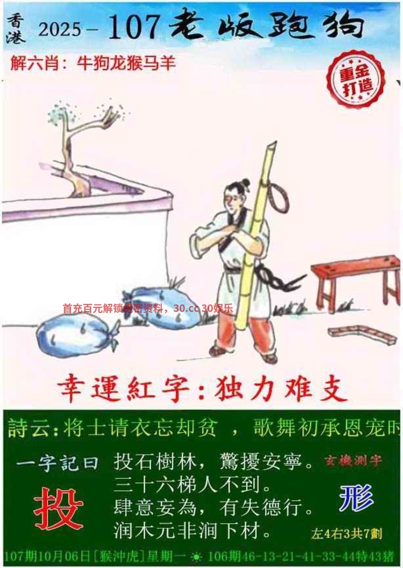 108期:今期牛狗蛇看定,特碼旺大和单出开猪07准